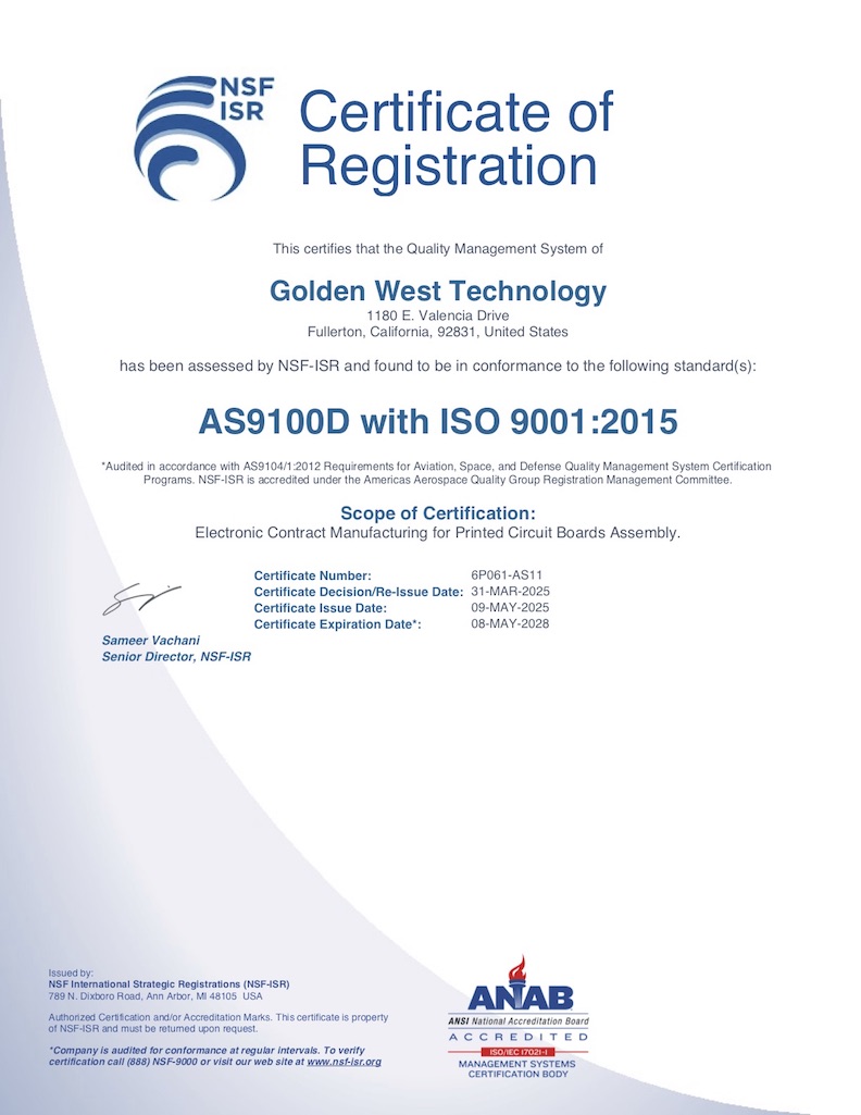 As an AS9100D and ISO 9001:2015 certified manufacturer, Golden West Technology delivers reliable, high-quality assemblies through disciplined processes, strict process control, and continuous improvement.